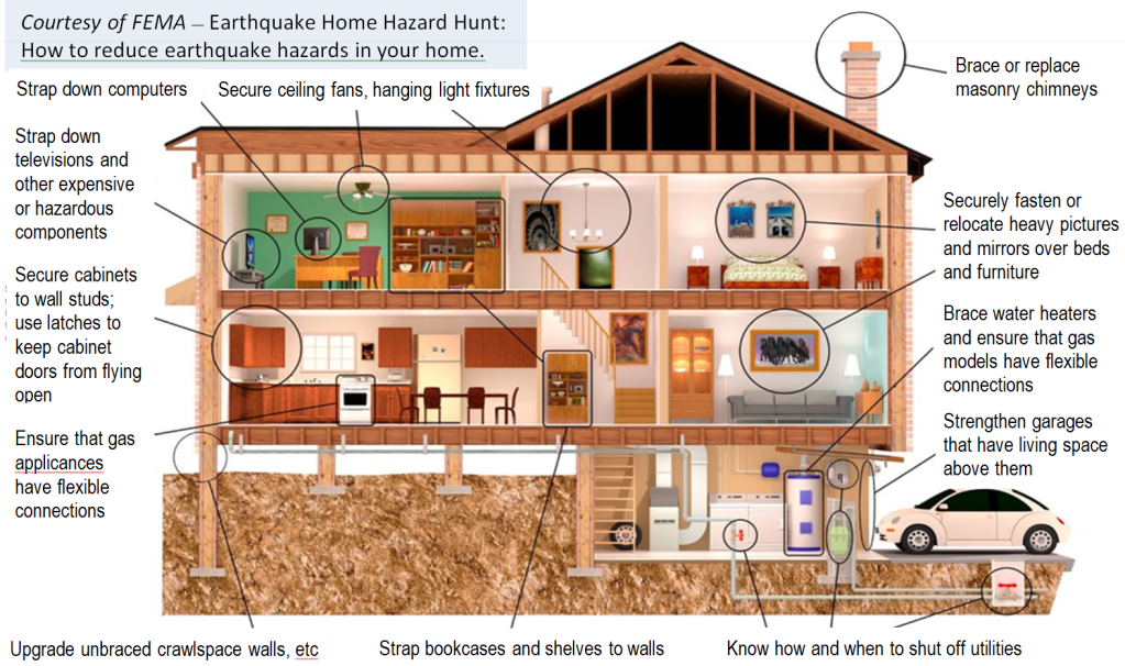 - Secure your home. Make sure your house is as shakeproof as possible by retrofitting weak spots, strapping down heavy furniture and securing loose objects; this should be accomplished as a result of completing the Home Hazard Hunt above.
